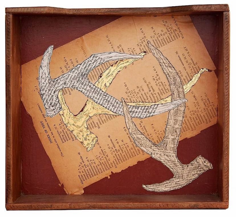 Pen and ink antlers drawn on vintage French dictionary pages and gold leaf. Collaged onto a found and repurposed drawer. 12"x11" Charlottesville VA 2012